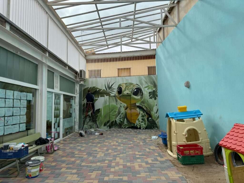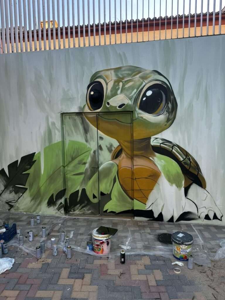 La protagonista de este nuevo mural es una tortuga que, con un estilo moderno y muy cuidado, aporta calma, fantasía y un aire renovado al patio. Más que un graffiti, se trata de un auténtico diseño gráfico que invita a mirar, imaginar y disfrutar del entorno que nos rodea.